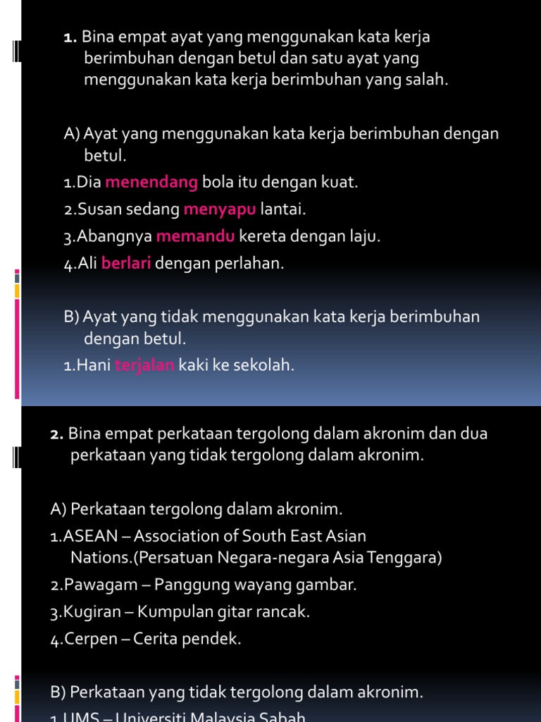 2112016 Bina ayat contoh ayat untuk perkataan. Kenal pasti dan bina ayat menggunakan akronim yang terdapat dalam petikan. Periksa terjemahan stamina ke dalam Bahasa Melayu.
