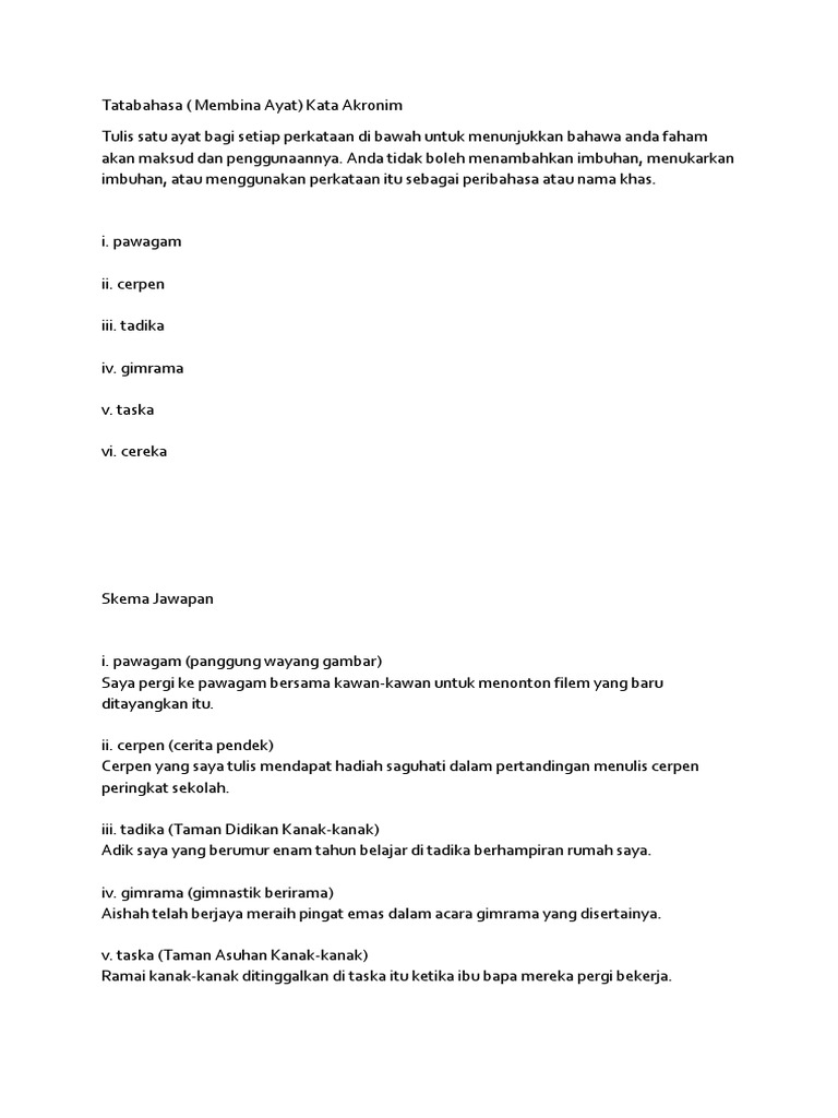 Akronim Perkataan Asal cerpen cerita pendek kugiran kumpulan gitar rancak pawagam panggung wayang gambar purata pukul rata tadika taman didikan kanak-kanak tabika taman bimbingan kanak-kanak halaju Nota had laju Kata akronim jenis ini dibentuk melalui percantuman suku kata awal sejumlah perkataan. Banyak rumah yang telah musnah akibat dilanda bencana _____ beberapa tahun yang lepas. A Tok Dalang C Hang Li Po B Tok Selampit D Hang Tuah 17.